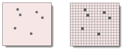 点在栅格数据结构中由一个像元表示,其数值与邻近像元值明显不同,如下图所示。一个点是没有面积的,但像元代表着现实世界地表上一定区域的面积,当像元的空间分辨率越小时,所覆盖的面积越小,用像元表示的点也就越接近其实际尺寸和位置。在进行矢量点到栅格点数据的转换时,当多个点落在同一个像元范围内时,系统会从中随机选择一个点作为该像元的值,所以生成的点栅格数据的要素数量可能会减少,而且栅格的像元大小越大,损失的要素点数越多。