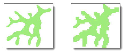 面要素在栅格数据结构中由聚集在一起的相互连接的像元组成,面内部的像元值相同,但与邻域网格的值差异较大,如下图所示。栅格表示多边形时的精度与像元的大小有关,像元的大小越小,描绘面所用的像元数越多,精度也就越高。在矢量多边形转换为栅格多边形的过程中,像元的值是取占据像元大部分面积的多边形要素的属性值。