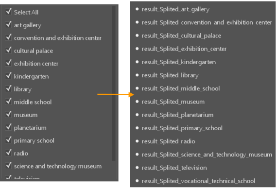 The application will generate datasets according to the attribute categories. For example, when splitting a dataset as provincial administrative divisions, we got 34 resulting datasets. Each province corresponds with a dataset.