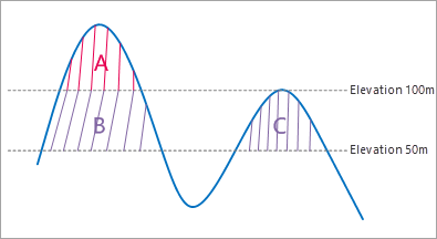You need to specify a height datum as the elevation of datum plane. As follows, given the height datum 50 meter, the measured result contains the volumes of the three areas A, B, C which are enclosed by the datum plane and raster data. However, if the height datum is set as 100 meter, only the volume of the area A will be measured.