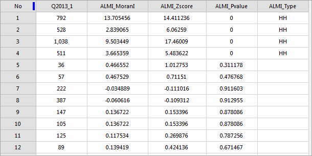 | P value (ALMI_Pvalue) | Moran index (ALMI_MoranI) | Implication | Cluster and outlier type (AIMI_TYPE) |