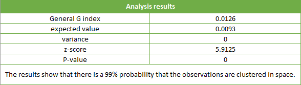 The results show that the P value is less than 0.01, Z score is greater than 2.58, and distribution is clustering distribution with 99% confidence. The general G value is higher than the expected value and Z value is significant. The result shows that the ratio and number of incidents in that year tend to be highly clustered. It shows that the ratio and the number of incidents of the disease are clustered in high-value areas.