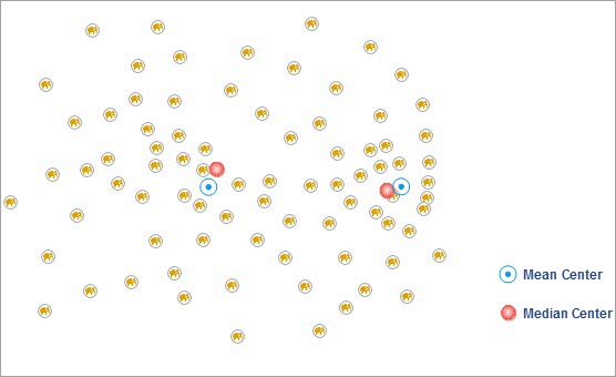 Mean center and median center are central trend measurements. However, in comparison, the median center is less sensitive to extreme values than the mean center. For example, the results of the calculation of the mean center of the compact cluster point are somewhere in the center of the cluster. If you add a new point away from the cluster and redo the mean center, you will notice that the result will be close to the new outlier. If you want to perform the same test using the median center tool, you will find that the new outliers have significantly less impact on the result location.