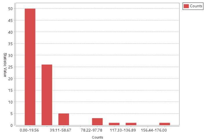 Set Datasource to OptimizedHotSpot, Dataset to T911Calls, and Aggregate Method to Aggregate Polygon, we got the optimized hotspot analysis result and the statistic diagram that indicates the number of incident points on each grid.