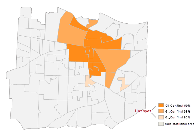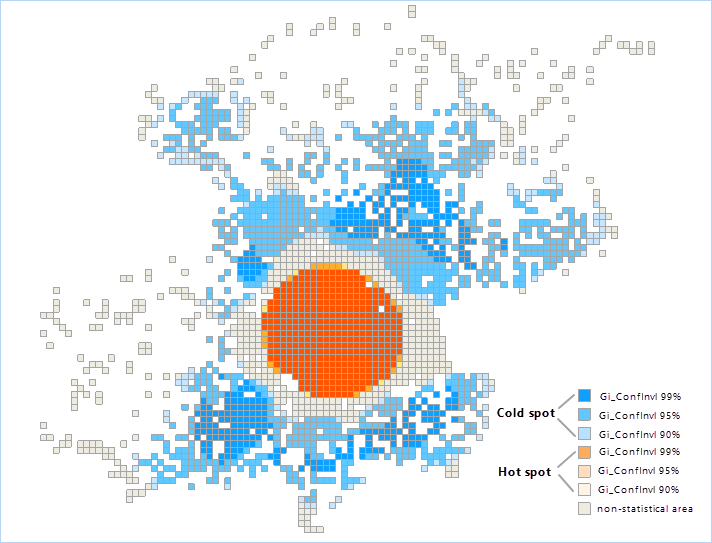 - The Gi_ConfInvl field identifies the hot and cold spots of statistical significance. The features of Gi_ConfInvl for +3 to -3 reflect the statistical significance of the confidence level of 99%. The features of Gi_ConfInvl for +2 to -2 reflect the statistical significance of the confidence level of 95%. The features of Gi_ConfInvl for +1 to -1 reflect the statistical significance of the confidence level of 90%. The clustering of the features of Gi_ConfInvl for 0 was not statistically significant.