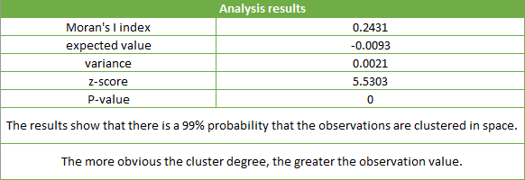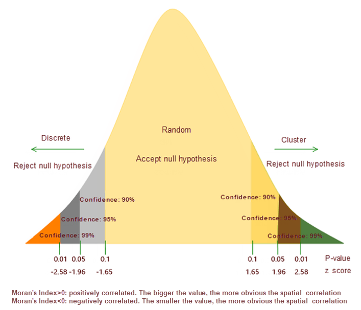 The Spatial Autocorrelation returns five values: the Moran's I Index, Expected Index, Variance, z-score, and p-value. Using z-score or p-value indicates statistical significance, you can refuse to null hypothesis, if Moran 's index value is positive, I have said this data with spatial correlation, the analysis of the dataset is used to value is proportional to the spatial concentration; If Moran's I index is negative then indicates the discrete trend.