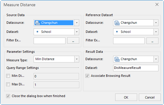 Figure Measure Distance dialog box - The result is attribute table data, recording school ID, distance information and IDs of hospitals nearest to schools. Through Append Column, you can append Hospital_ID and Distance field information in the attribute table to the point dataset for schools.