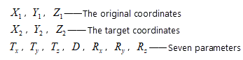 - China_3D_7P(7-para): the model is used for the translation among geodetic coordinate systems based on different ellipsoid datums. Besides the seven parameters, the semi major axes of reference ellipsoids and the flattening differences between them should be taken into consideration.