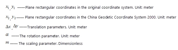 - China_2D_4P(4-para): The four parameter conversion model is used for the translation among different Gaussian projection plane coordinates. Four parameters are needed(two translations, one scale and one rotation). For a 3D coordinate, you need to obtain the relative plane coordinate through Gaussian projection and then calculate the required parameters.