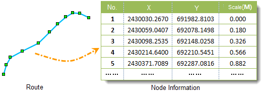 In SuperMap, there are two types of data structures for dynamic segmentation: Route and event table. Route is used to represent line object with measure values, and event table records the location of the events occurred along the route and other attributes.