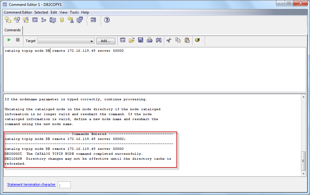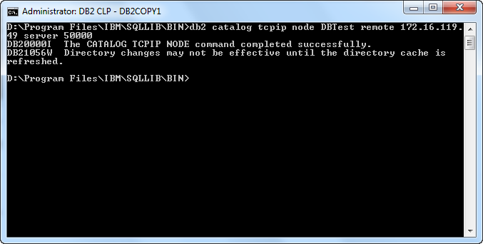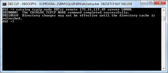The same with mode one, enter the command line processor through Program -> IBM DB2 -> DB2COPY1 -> Command Line Tools. Input the node catalog command in this processor:
