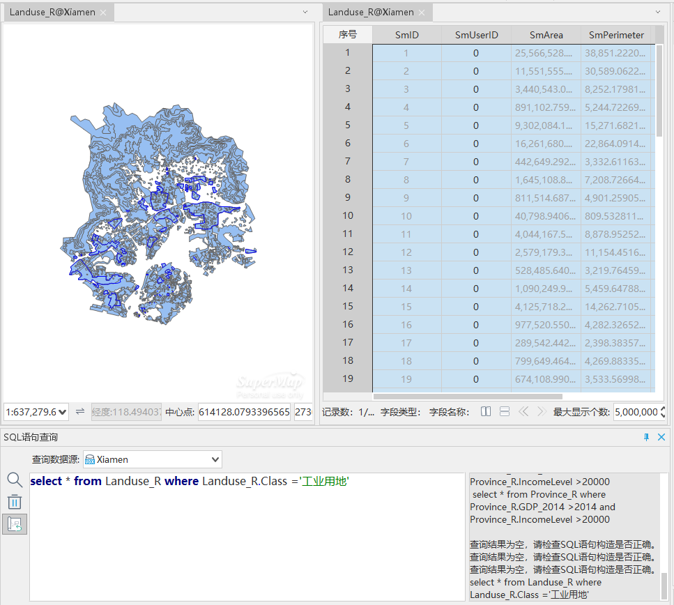 - 查询完成后,弹出本次查询结果属性表窗口与高亮查询结果的地图窗口。