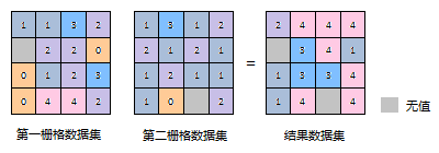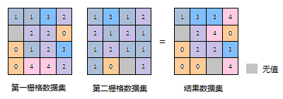 | 加法 | 栅格代数运算中的加法,是将两个输入栅格数据集中的像元值逐个像元相加的过程。 | ![]() |