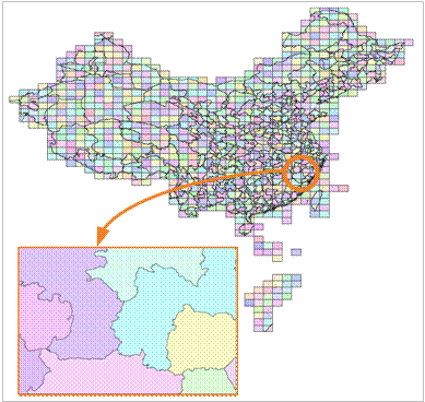 在 SuperMap SDX + 中根据数据集的某一属性字段或根据给定的一个范围(图幅的长和宽),将空间对象进行分类,通过索引进行管理已分类的空间对象,以此提高查询检索速度。如下图所示为中国市级行政边界图的分幅合成地图,根据给定范围创建图幅索引后,显示h4708的场景。图幅索引在海量数据(即对象数超过百万个的数据)的显示和查询时优势尤其明显。建立图幅索引后,在显示的时候,只显示你需要查看的那一幅或几幅地图,大大缩短显示时间。