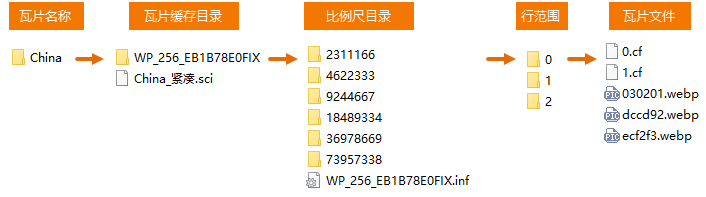 • 瓦片缓存目录:包括两个部分:索引文件(*.sci)和瓦片数据文件夹,在打开瓦片时,只需要打开*.sci文件,就会根据文件信息读取瓦片数据文件夹中瓦片信息。