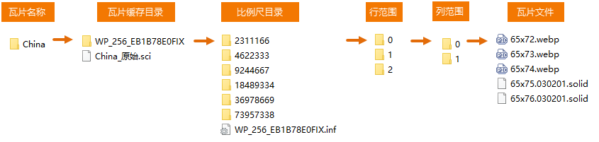 • 瓦片文件:包括原始瓦片文件(*.webp会根据瓦片格式变动)与纯色瓦片文件(*.solid)。在65×72.webp文件名中,65×72表示瓦片的位置信息(65行,72列);65×75.030201.solid文件名中,65×75为瓦片的行列位置信息(65行,75列),030201代表颜色值。