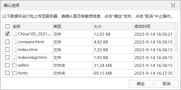 - 单击发布按钮,弹出确认选择对话框,您需要在列表中勾选需要上传至服务器的数据信息,避免误发布敏感信息。