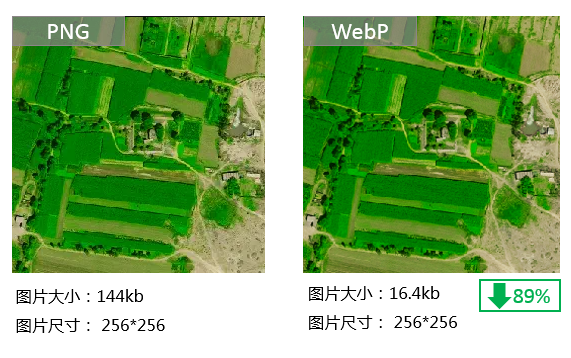 WebP 虽然会增加额外的解码时间,但由于减少了文件体积,缩短了加载的时间,页面的渲染速度加快了。同时,随着图片数量的增多,WebP页面加载的速度相对PNG页面增快了,所以,用户使用WebP瓦片浏览能直观体验到性能的提升。