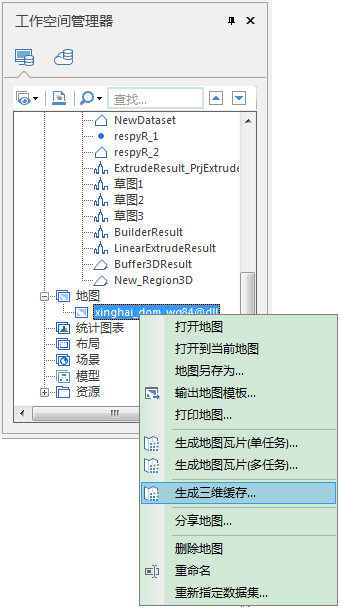 - 在工作空间管理器内的某一地图右键菜单中选择“生成三维缓存...”。
