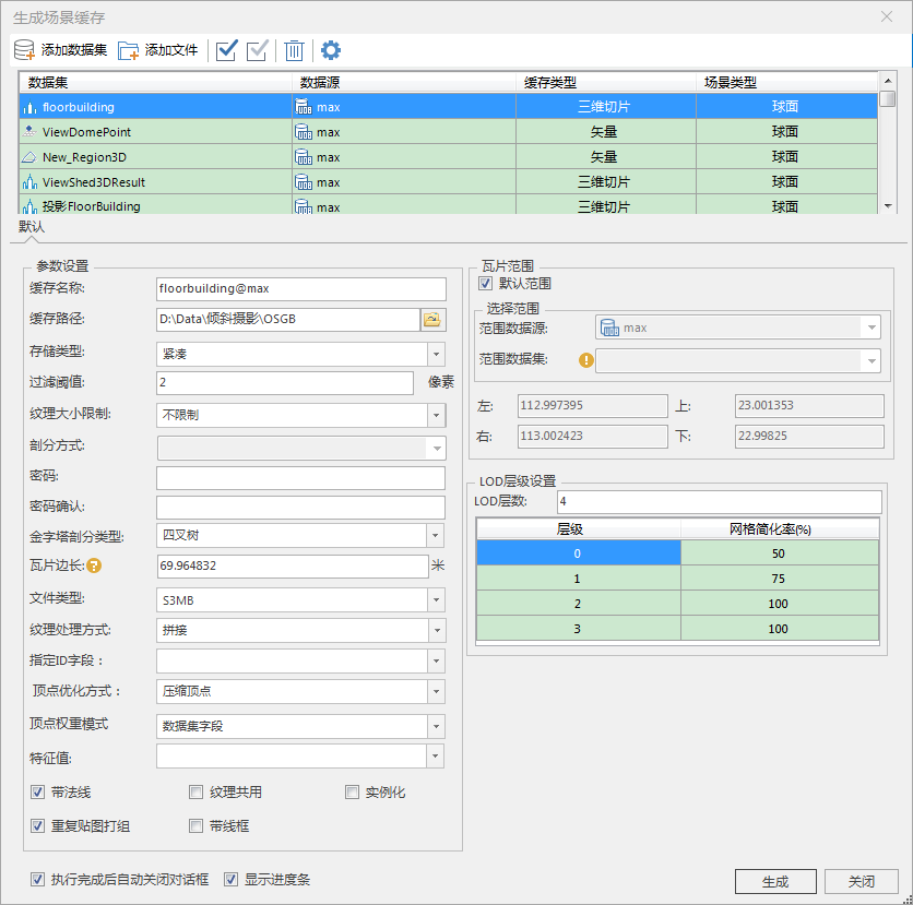 - “生成缓存...”可以手动添加生成缓存的数据;整个场景缓存只能对某一场景窗口中的已有数据集生成缓存,不能添加不存在于场景中的其它数据集。