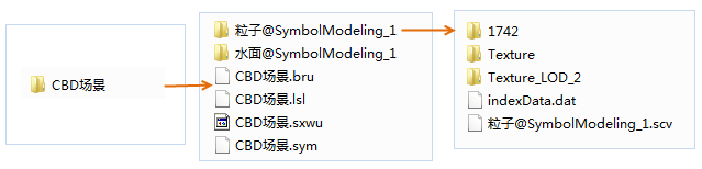 - 生成的缓存文件存放在以场景名称命名的文件夹下,例如 E:\Data\Cache 文件夹下,该文件夹下生成了以场景命名的子文件夹,存放了不同类型的缓存文件。CBD场景文件夹下保存缓存文件。其中“CBD场景.sxwu ”为保存的工作空间,在工作空间中保存了场景中各图层的风格信息。粒子@SymbolModeling_1缓存文件夹下,保存了粒子图层数据的缓存文件,即粒子@SymbolModeling_1.scv,若该文件为预缓存配置文件,则可供客户端使用。