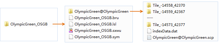 图:整个场景缓存生成结果(非三维切片缓存) 若缓存类型为三维切片缓存,则整个场景缓存的生成结果如下图所示,OlympicGreen@OlympicGreen文件夹中存放了OSGB数据的子文件夹,而子文件夹中保存着 *.osgb 数据。