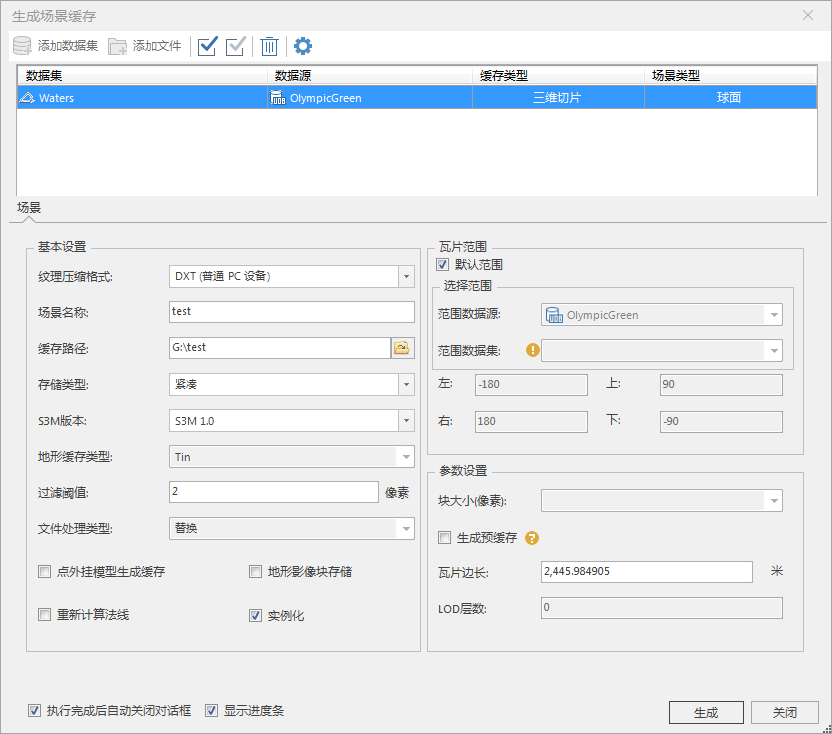 - “生成缓存...”可以手动添加生成缓存的数据;整个场景缓存只能对某一场景窗口中的已有数据集生成缓存,不能添加不存在于场景中的其它数据集。