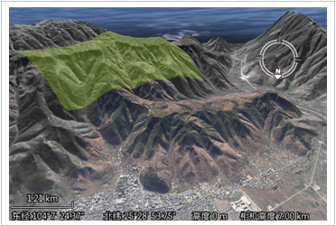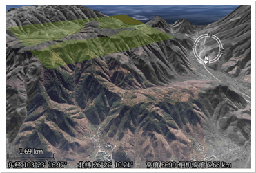 当使用贴地高度模式(ClampToGround)时,三维数据的海拔高度会完全被忽略,各个三维对象依据其经纬度和地形表面的起伏状态附着在地形表面,即相对于地形表面的高度为零。如下图所示,使用贴地高度模式(ClampToGround)时,面对象的海拔高度信息则被忽略了,面对象将依据经纬度坐标信息,依地形起伏的趋势附着在高低起伏的地形表面。