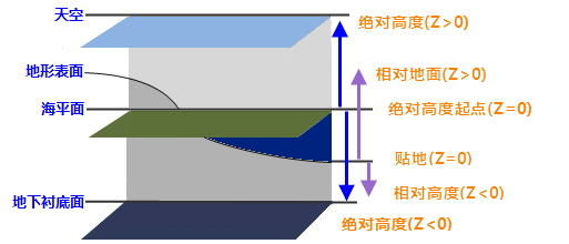 下图给出了不同高度模式对应的基准面以及高度值(Z 值)设置后对应的几何对象所放置的高度区域,由下图可知,绝对高度模式的海拔高度基准面为海平面,正方向与下图中箭头方向一致;贴地模式下,对象将附着在地形表面,相对地面、相对地下 高度模式的海拔高度基准面为地形表面,正方向与下图中箭头方向一致。