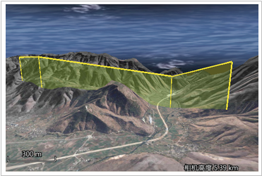 绝对高度模式(Absolute)下的海拔高度值是相对于海平面的海拔高度,该模式忽略地形的实际海拔高度,当知道精确的海拔高度值时,这种高度模式非常有用。如下图所示,场景中的一个面对象,该面对象边界节点的高程值均为5800米,在使用绝对高度模式(Absolute)时,该面对象的显示状态如下所示。