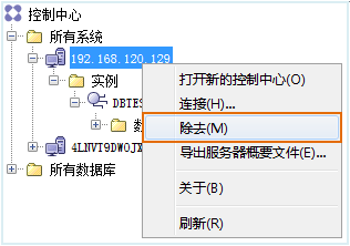 在“控制中心”左侧的目录树中,右键单击需要进行节点反编目的服务器系统,选择“除去”项即可。