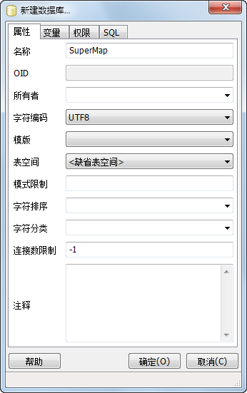 1. 如下图所示,在已启动的数据库服务器的“数据库”组上单击鼠标右键,单击“新建数据库...”项菜单,弹出“新建数据库”页面窗口,即可创建一个新名为“SuperMap”的数据库。