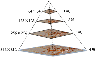 如果为影像数据创建影像金字塔的话,可以大大提高数据的浏览速度。影像金字塔是栅格数据集一系列简化分辨率图像的集合,通过影像重采样方法,建立一系列不同分辨率的影像图层,每个图层分割存储,并建立相应的空间索引机制,从而提高缩放浏览影像时的显示速度。如图所示的影像金字塔的一个例子,这个影像金字塔共有4层,即4个等级的分辨率,对于图像分辨率为2a×2b的(a>b)影像,SuperMap中将会为其建立(b-6)+1层的金字塔。