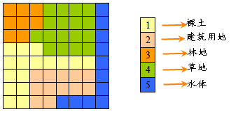 GRID数据模型:是栅格数据模型的一种,将一个平面空间进行行和列的规则划分,形成有规律的网格,每个网格称为一个单元格(或像元),栅格数据模型实际就是单元格的矩阵,一般每个单元格都有确定的值来表示地理实体或地理现象,如土壤类型、土地利用类型、岩层深度等,对于数据缺失的单元格,通常用 NoData 或者一个固定的特殊值来表示,比如-9999等。下图所示为土地利用类型图像: