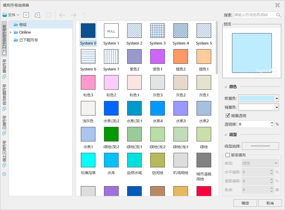 - 背景透明:勾选该复选框后,填充符号的非填充内容将设置为透明效果,此时“背景颜色:”的设置无效。