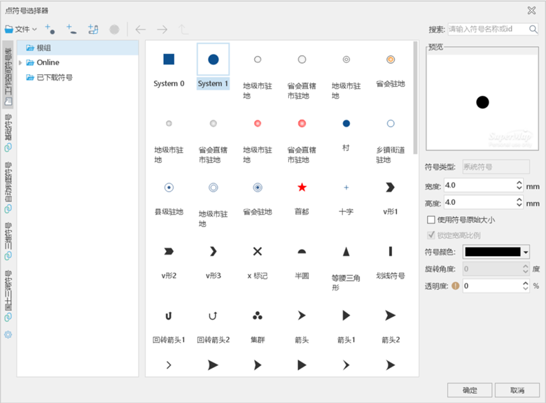 如下所示,符号库窗口当前所加载的为点符号库,下面介绍如何通过符号库窗口设置点符号: