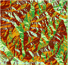 - 坡向图:对 DEM 栅格数据生成坡向图。系统默认设定的光源方位角为360度、光源高度角为45度、高程缩放系数为1。