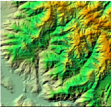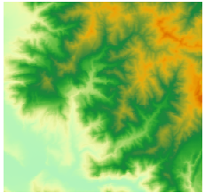 - 三维晕渲图:是通过考虑栅格表面照明源的角度和阴影,生成三维晕渲效果图。三维晕渲图是通过模拟实际地表的阴影从而反映出地形起伏状况的栅格图。通过采用假想的光源照射地图,结合栅格数据得到的坡度坡向信息,获得各像元的灰度值。面向光源的斜坡的灰度值最高,背向光源的灰度值较低,即为阴影区,从而形象地表现栅格实际的地貌和地势。由于栅格数据计算得到的这种山体阴影图具有非常逼真的立体效果,因此称为三维晕渲图。当栅格参数选择三维晕渲图时,系统默认设定的光源方位角为315度、光源高度角为45度、高程缩放系数为1。
