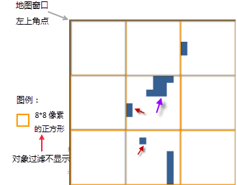 过滤重叠小对象:是指在显示图层中的小对象时,单位像素区域只进行一次绘制,因此,该区域只会显示一个小对象,其他重叠小对象不显示。
