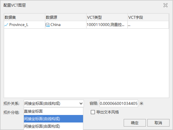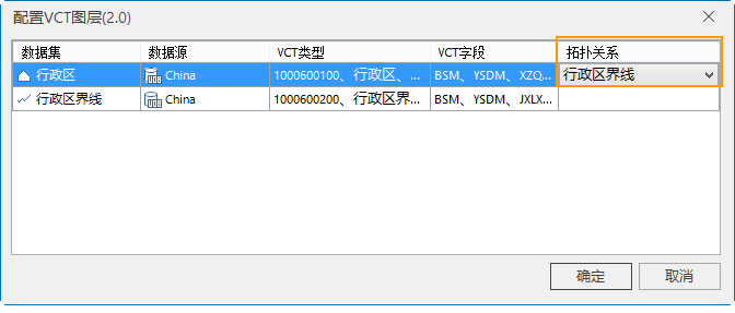 - 拓扑关系:配置与导出面数据集存在拓扑关系的线数据集。如果在此指定了某一面数据集与线数据集之间的拓扑关系,则须将该线数据集和面数据集同时导出至改VCT文件。例如设置面数据集行政区与线数据集行政区界线建立拓扑关系,则导出VCT文件中必须包含数据集行政区及行政区界线。