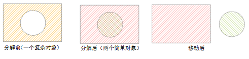 如下图所示为一个岛洞多边形,对它进行分解操作之后,得到的新对象为两个单一的对象: