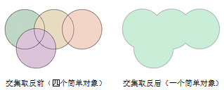 如果参与运算对象续相交于面,且无两两相交部分(即公共相交部分),则参与运算的对象会合并成一个简单面对象。