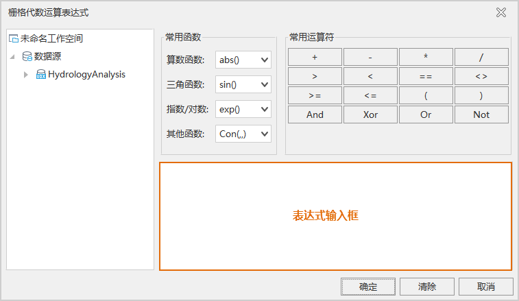 在左侧工作空间中列出了当前工作空间中的所有数据源与数据源下的数据集,便于您在输入运算表达式时快速选择输入的栅格数据集。