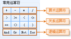 SuperMap 提供的常用运算符包括基本的算术运算符、关系运算符和逻辑运算符三类,如下图所示。单击运算符所在按钮即可在上方的表达式对话框中显示相应的运算符号。详细说明请参见常用运算符