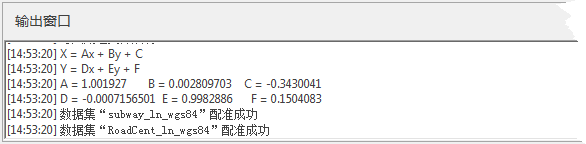 - 执行配准:如果是进行矢量配准,并且配准方式为线性配准或者二次多项式配准,在配准结束后,应用程序会在输出窗口中显示配准转换的公式及各个参数值,以便用户查阅。如下图所示: