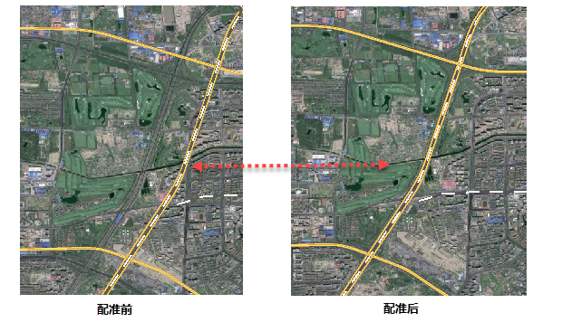 - 在将配准后的矢量数据叠加在影像上,查看配准结果,放大至道路交叉口,可看到配准前道路偏移严重,而配准后与影像道路重合,配准成功。如下图所示: