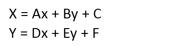 也称仿射变换。这种配准方法假设地图因变形而引起的实际比例尺在 X 和 Y 方向上不相同,因此,具有纠正地图变形的功能。假设 x, y 为输入图像的原始坐标,X,Y 为纠正后的输出坐标,则坐标变换的公式如下: