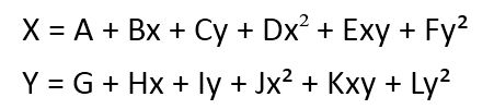 上式中共有12个参数,理论上需要6对控制点就可实现转换,但为了得到比较高的精度,一般要求二次多项式纠正的控制点为至少7对,适当增加控制点的个数,可以明显提高影像配准的精度。多项式系数是用所选定的控制点坐标,按照最小二乘法求得的。对比多项式纠正公式与线性纠正的公式,可以看出线性配准其实是一次的多项式配准,二次多项式纠正比线性配准需要更多的控制点对,也会纠正更多的变形。