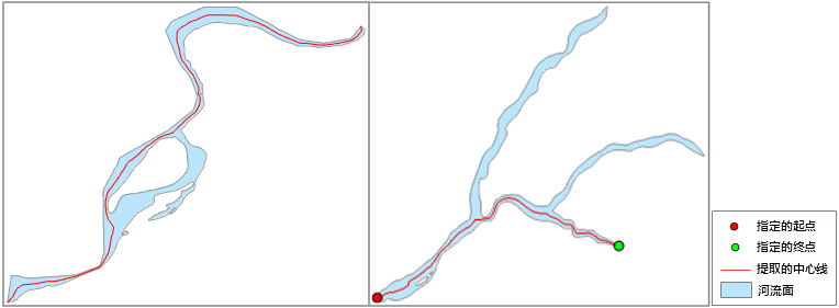 面主干中心线是指提取面数据集主干道面对象的中心线,即按面对象的最长距离进行提取,并将结果保存为线数据集,一般用于提取河流的主干中心线。
