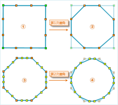 - 下面是用磨角法对封闭四边形进行光滑处理的过程,光滑系数是 2 即进行两次磨角处理。